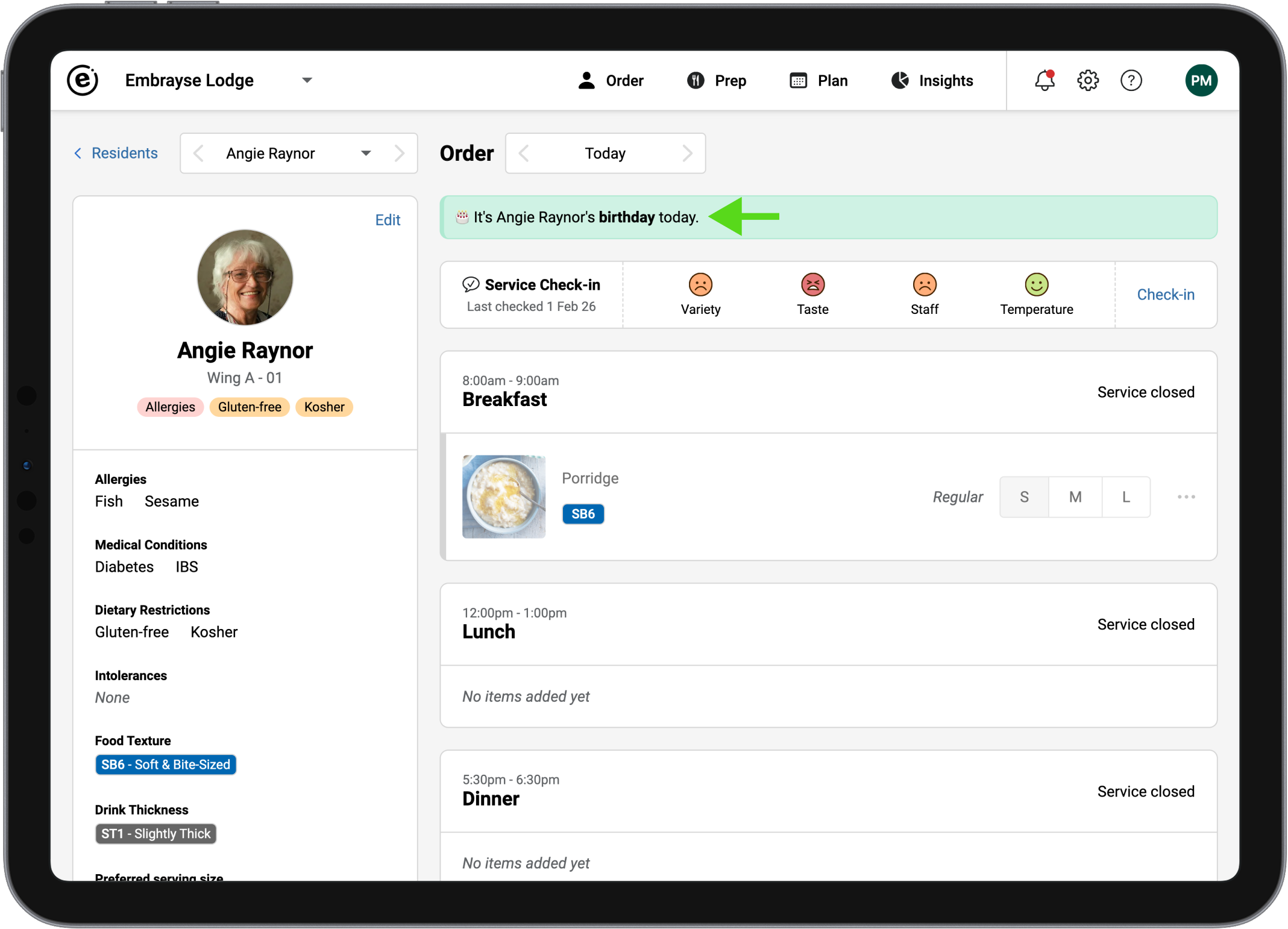 When a resident's birthday is approaching, a cake emoji appears under their name in the resident list, and a birthday banner is shown at the top of their order page:
