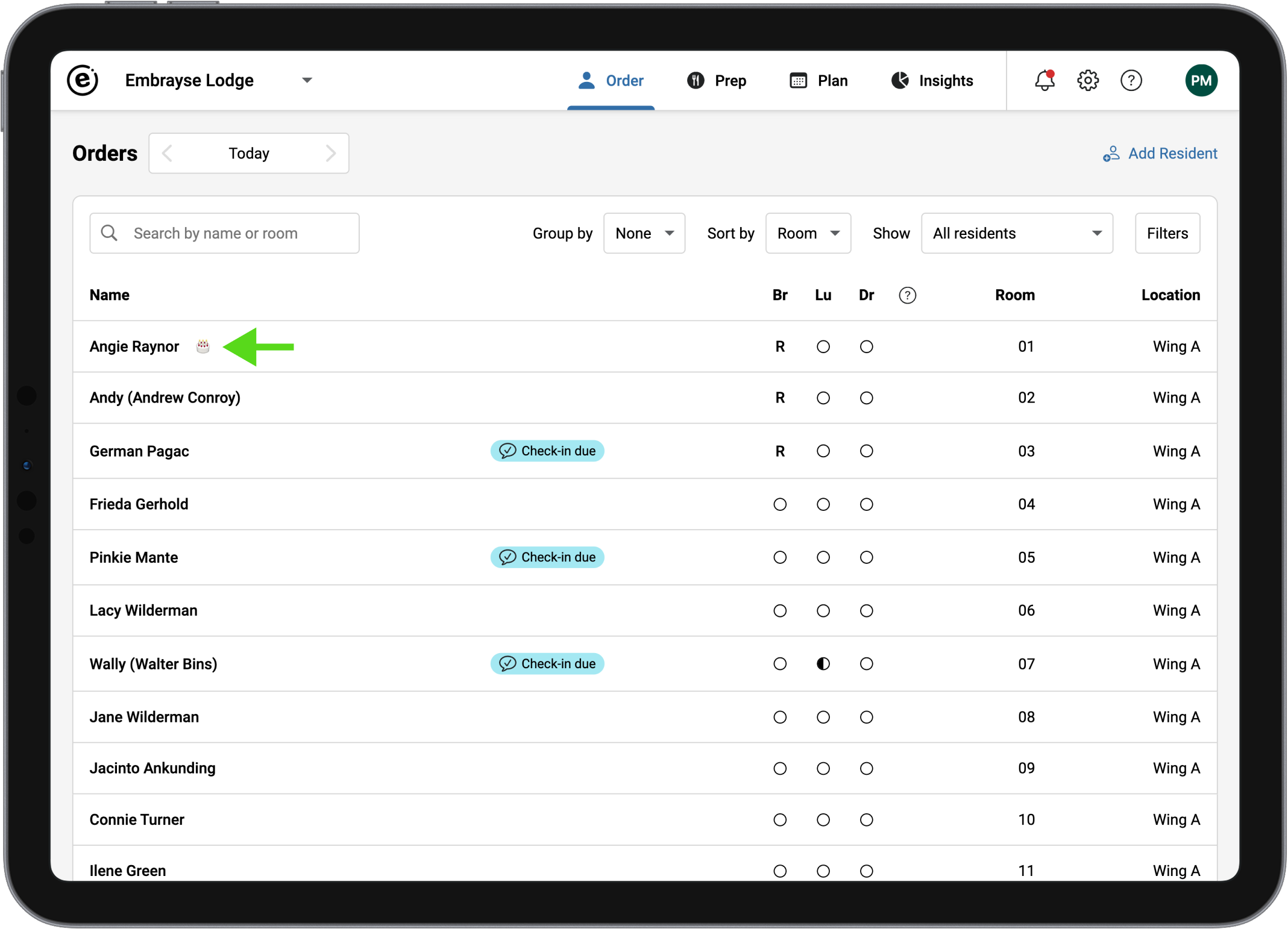 Embrayse displays a birthday indicator next to a resident's name in the resident list to help staff remember upcoming and same-day birthdays.