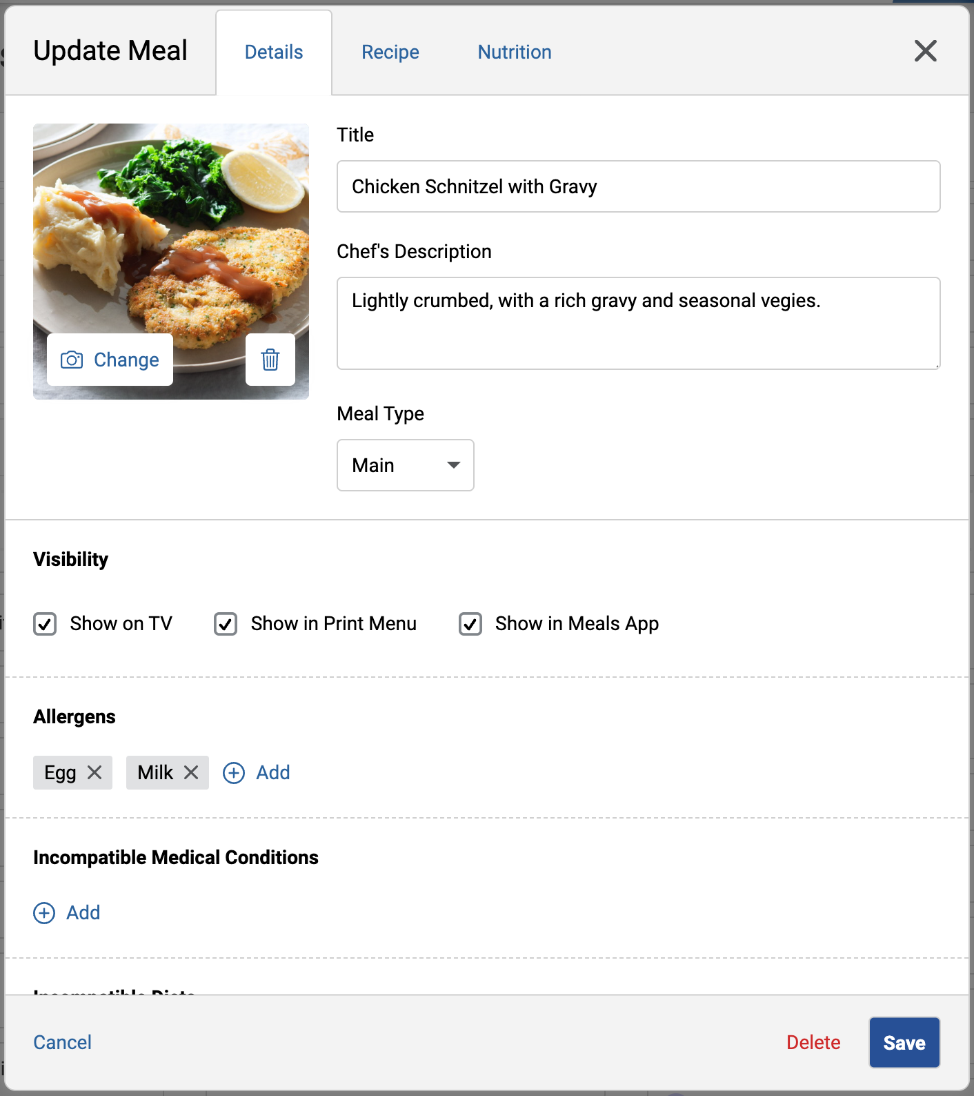 Upload an image of the meal. Clear photos, ideally taken from your own meals, help residents choose their meals, especially on TV menus and in the mobile app, and sets appropriate expectations.