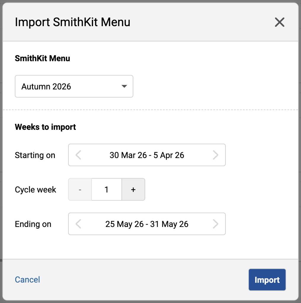 Best practice: Import your menu once at the beginning of the season, then manage all details and changes within Embrayse for the rest of the season. This gives you the benefit of SmithKit's menu structure while allowing full flexibility for customisation.