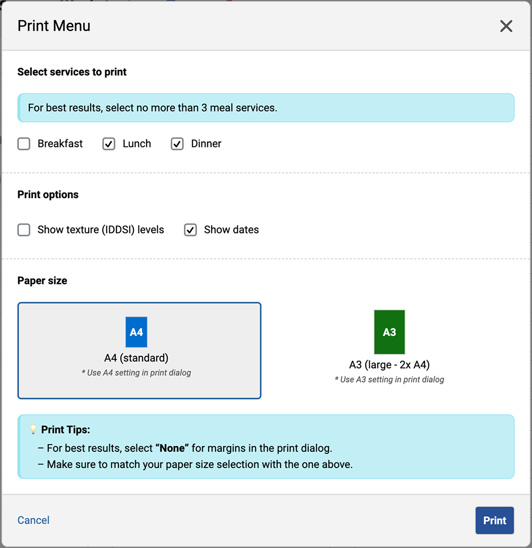 The printed menu shows the week date range, selected meal services organised by day, and IDDSI texture codes (if enabled).