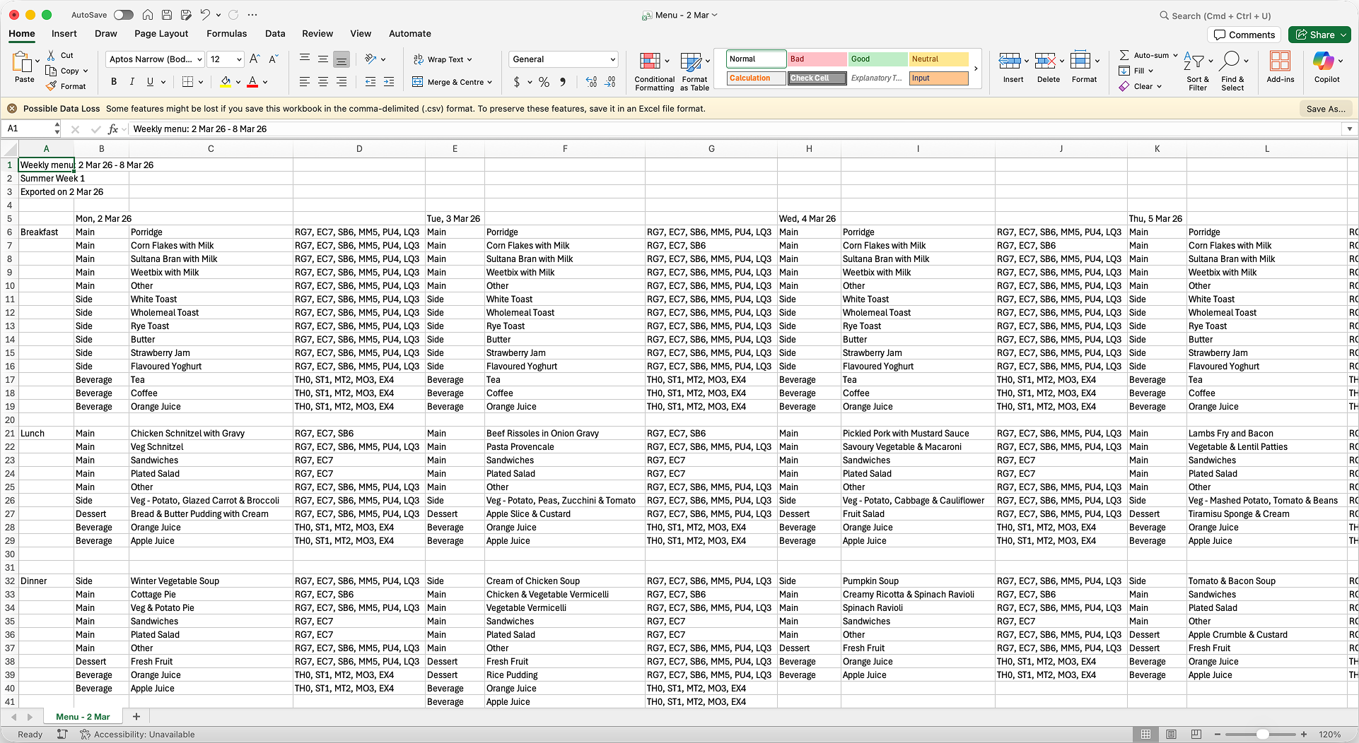 Export menus to CSV format for use in Excel, Google Sheets, or for sharing with dietitians, procurement, and other stakeholders.