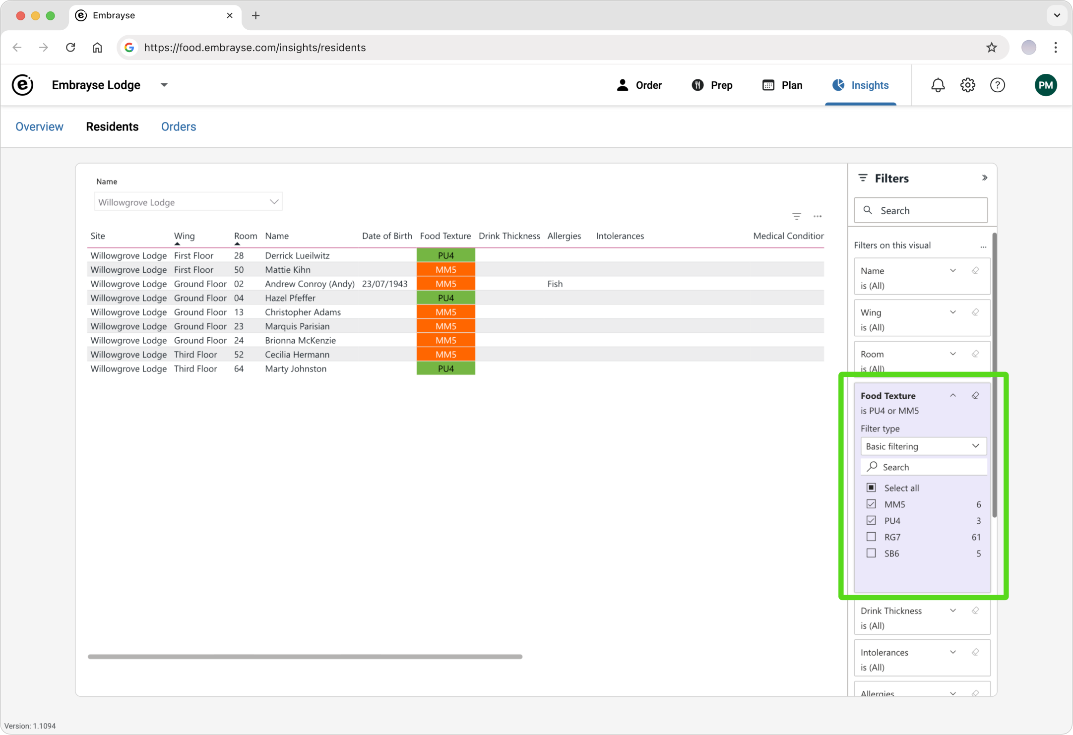 The Filters pane on the right side of the report lets you filter the table by any resident dietary field – for example, to find all residents requiring a particular food texture, or all residents with a specific allergy.