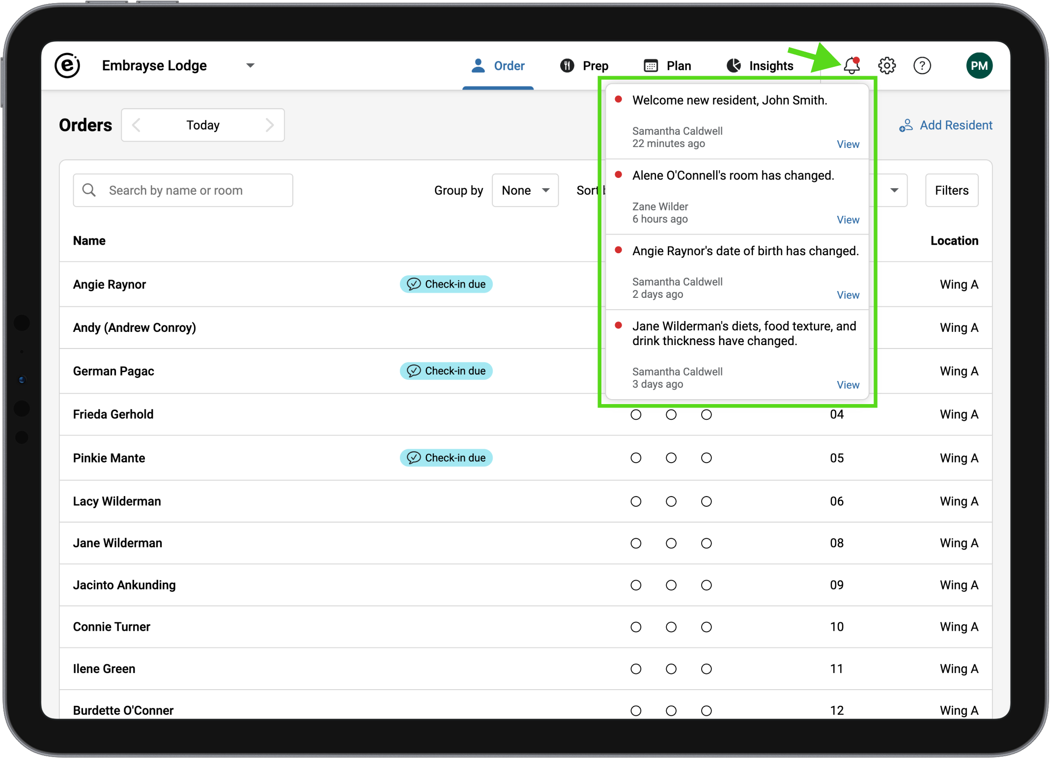Tip: Make it a habit to check the notifications panel before each meal service to catch any recent changes to resident dietary profiles.